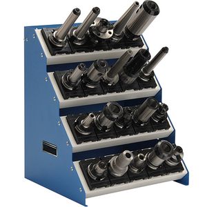 Das modulare CNC-Baukastensystem lässt ein übersichtliches, arbeitsplatznahes Zwischenlagern auf der Arbeitsplatte zu. Die verschiedenen Tischaufsätze nehmen über die Universalkassette alle CNC-Werkzeugeinsätze auf.