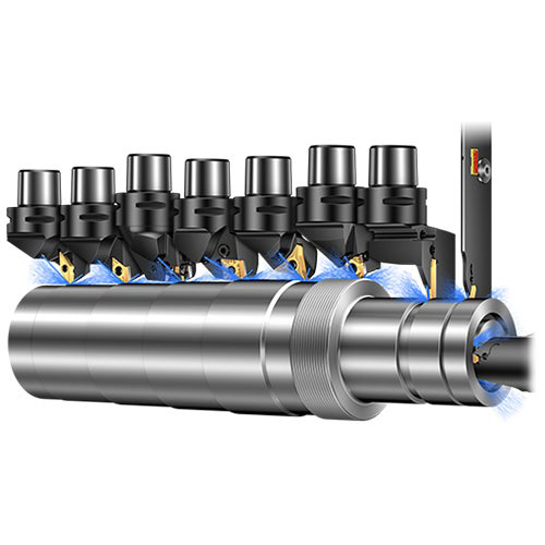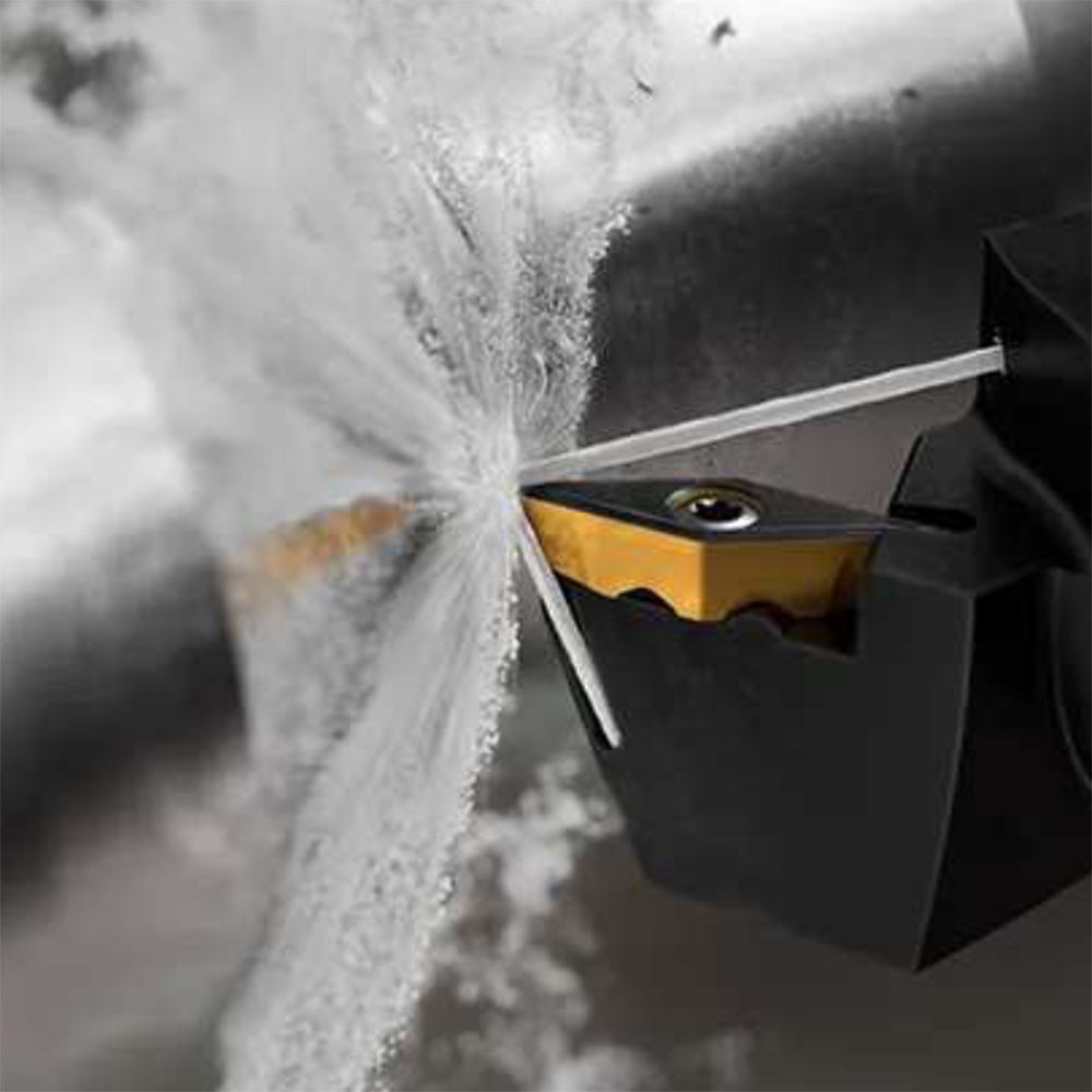 Die obere Präzisionskühlung kontrol-liert die Spanbildung für eine prozess-sichere Zerspanung, während die untere Kühlschmierstoffzufuhr durch die Temperaturregulierung zu langen, vorhersagbaren Werkzeugstandzeiten beiträgt. Der Kühlschmierstoff hat außerdem positive Auswirkungen auf die Oberflächenqualität der Bauteile.