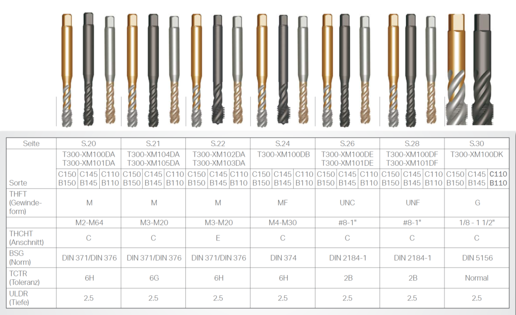CoroTap 300 ist ein Programm an spiral genuteten Gewindebohrern, die für das Gewindebohren in Grundbohrungen bis zu 3 × D ausgelegt sind. Es gibt mehrere Steigungswinkel für unterschiedliche Anwendungen. Dieses Programm zeichnet sich durch universelle Gewindebohrer ausgelegt für unterschiedliche Werkstoffe und optimierte Gewindebohrer für spezifische Werkstoffe und Anwendungen aus. Tailor Made und Advanced Engineered Werkzeuge sind innerhalb der Kategorie Kundenspezifische Lösungen erhältlich.